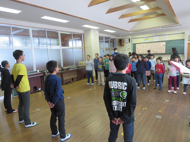 業間の全校音楽で、卒業式で歌う曲の練習は、6年生と向かい合って・・・・。