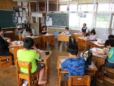 今月の食育の日は,たてわり班ごとに集まって給食を食べました。子どもたちは,いつもとちがった雰囲気の中で,輪になって給食を食べました。この日のメニューは,食パン・ワンタンスープ・れんこんサラダ。デザートは,なんと”南小国町産のホームランメロン”でした。みんな,「美味しい!美味しい!」とニコニコ顔で食べていました。