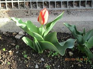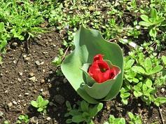3・4年生の花壇をのぞくと、何とそこにチューリップの花が咲いていました。とってもミニサイズの花で、かわいいなあと見つめてしまいました。このまま春になっていくのでしょうか。それとも3月の雪、4月の雪があったりするのでしょうか?
