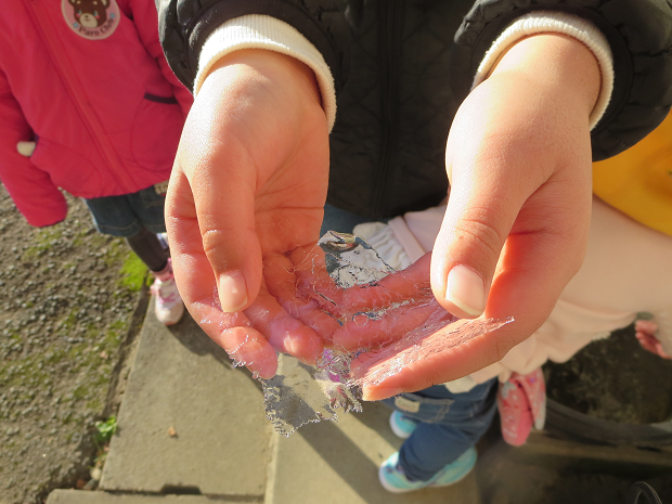 12月13日朝も、またまた子どもたちは分厚い氷を拾ってきました。