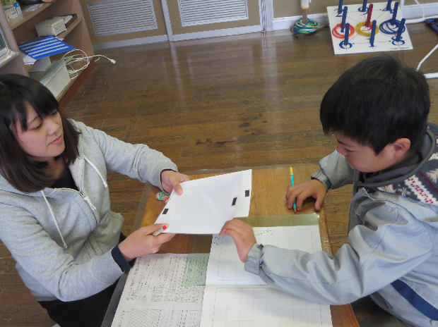 「書きました」と言うことや、「えんぴつを置く」とか、「姿勢を正す」とか、「目を合わせる」などひとつひとつは、彼が自分で考えていることを伝えてくれるための、ふたりの間のきめごと。それは、できることが増えるたびに、変わっています。