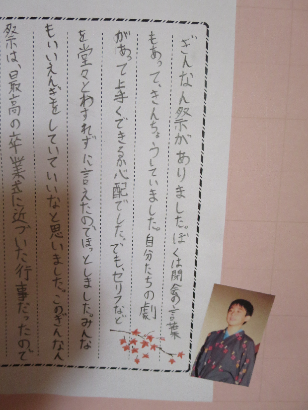 「せいこうしたぎんなん祭 ぼくはぎんなん祭で、せりふをちゃんといえたのでよかったです。○○○くんも、しっかりと言えたのでよかったです。」 (2年生)