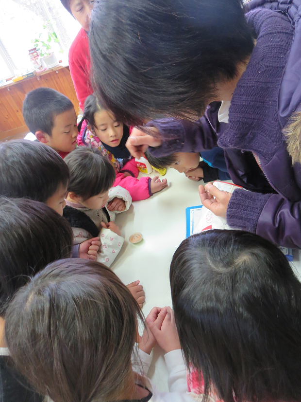 ペレットストーブの暖かい空気が、登校中に拾ったうす~い氷を持った子どもたちを迎えました。