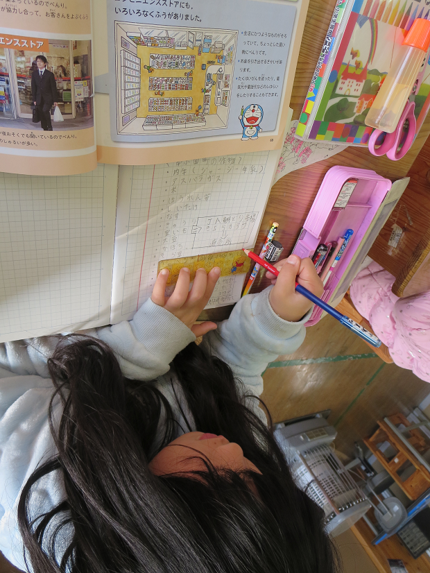 2年生では、まず担当の5.6年生が課題をまず自分でしてから、2年生のまるつけをしてくれます。