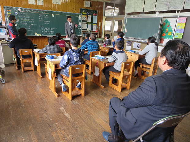4時間目に5.6年教室で授業をしているのは町長さんです。