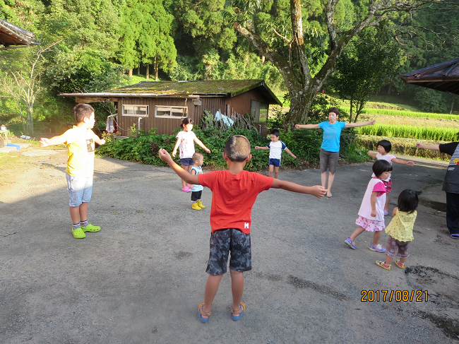 三人に合わせて、向かいのご自宅の庭で、おばあちゃんが一緒にラジオ体操をしてくださっていました。