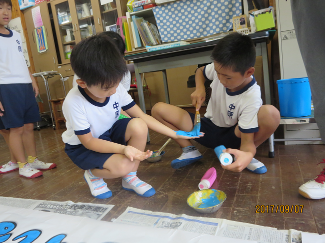 1年生が、運動会の絵を描いていました。