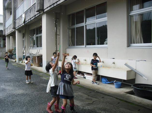 1年生が、生活科で、「水でっぽう」を作りました。「シャボン玉」もしていました。テーマパークのイベントみたいに、興奮していました!