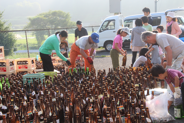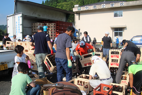 初めて参加の校長先生が、どんどん届くビンを運びながら