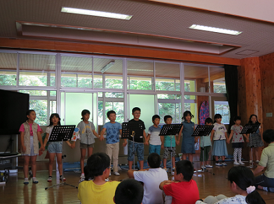 6月19日、業間に3.4年生が、全員で「子どものせかい」などを合唱。