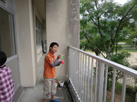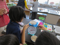 まずはシャボン玉で練習をしてから、こんどは画用紙に向かいました。