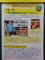 今日の給食は、南小国産あか牛のビーフシチューでした。朝から牛を飼っている女の子が、「今日は、知り合いの家の牛が給食で出ますよ。」と教えてくれました。