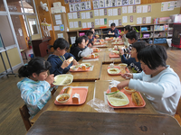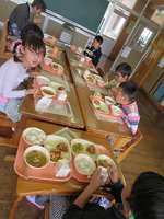 今年から、給食当番さんがコンテナ室に食器や食缶を取りに来たときに「いただきます」返しに来た時に「ごちそうさま」を言うようになりました。