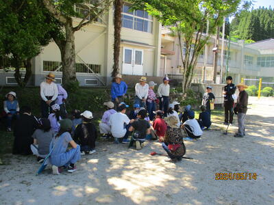 14日(火)も素晴らしい天気に恵まれました。この日は、3~6年生の子どもたちが、中原でグランドゴルフに親しんでおられる老人会の皆様とグランドゴルフを楽しみました。クラブ活動の一環として、高齢者の方々と触れ合うことや異学年での協力などを目的として実施されました。8グループに分かれ、玉の打ち方やスコアの書き方など教えてもらいながらコースを進めていきました。「上手!上手!」「惜しい!」「しっかり打ちなっせ~」など、楽しそうな歓声が運動場の至る所から響いていました。「また一緒にしたいです」「だんだん打てるようになって嬉しかったです」などの感想も聞かれました。老人会の方からは、「今日は、若返ったごたるです」「楽しかった~」と笑顔で帰っていかれ、学校としても、企画をしてよかったと思える時間となりました。暑い中、本当にありがとうございました。