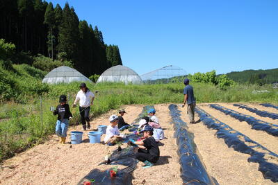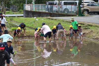 5月30日(木)の3時間目に「田植え体験」を行いました。今年も,鞭馬さんの水田をお借りして体験をさせていただくことができました。校長先生のお話にもありましたが,学校の授業で身近に田植え体験ができるなんて,なかなかできないことです。本当にありがたいなと思いました。子どもたちも事前にそのような気持ちをもって,この体験に臨みました。今年の品種は「あきげしき」。5・6年生から後ろに植えていきました。植え方のお手本を見せてもらいながら,下学年もしっかりと植えていきました。また,保育園からかわいいお客様も来てくれて,一緒に体験を楽しみました。また,保護者の方々や地域の方々も来ていただき,賑やかな田植えの時間となりました。最後に鞭馬さんが「稲が大きくなる様子を時々見て,秋にまた稲刈りをしましょう!」とお話してくださいました。種まきや苗の準備,代掻きなど,本当にありがとうございました!