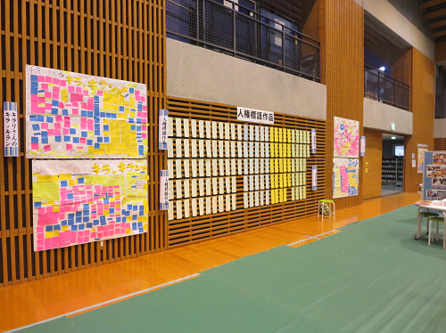 南小国中学校体育館に、各学校をまわったキラッキランの掲示がありました。