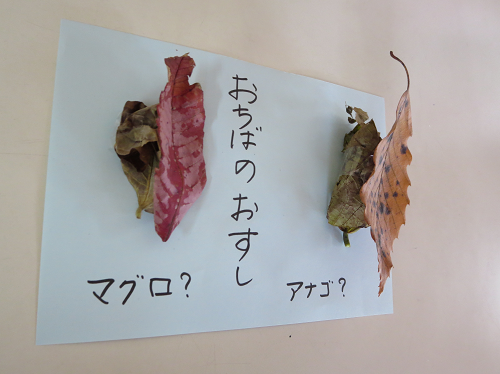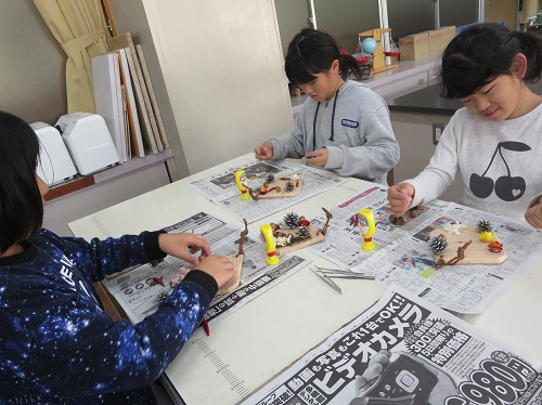 どんぐりやまつぼっくりは、講師がお休みの日に拾いに行って、きれいに加工したり、色を付けたり、全て準備してくれました。)