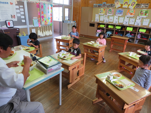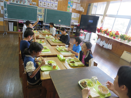 今月は、子どもたちはいつもの教室にいて、先生たちだけが交代をして給食を食べました。