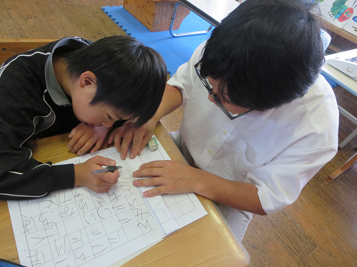 今は先生と一緒にお話をしながら、文字を作文用紙に書いたものを発表しています。