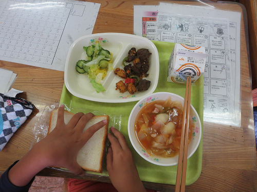 今月は、子どもたちはいつもの教室にいて、先生たちだけが交代をして給食を食べました。