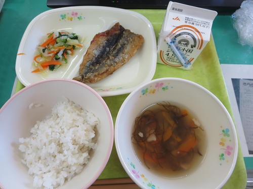 麦ごはん 牛乳 ファイバースープ イワシのかば焼き風 カミカミするめ和え