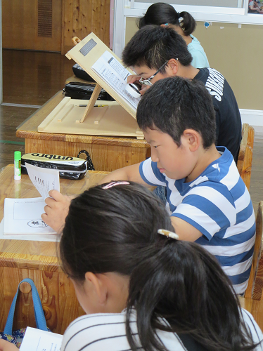 今は先生と一緒にお話をしながら、文字を作文用紙に書いたものを発表しています。