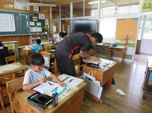 4年生がすいすい自分のペースで書くのを背中に見ながら、三年生が「二」を書きました。