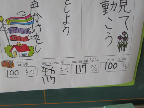 給食の配ぜんを待つ間に本を読むのは全クラスですが、他にも、放課後にちょいとできたすきま時間に、たくさんならべている担任の先生の本の棚から一冊を、電子黒板読み聞かせなどなど!