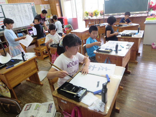 4年生がすいすい自分のペースで書くのを背中に見ながら、三年生が「二」を書きました。