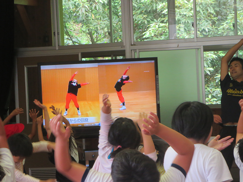 業間体育は、今年も大村詠一さんのくまモン体操DVDを見て一緒に!です。
