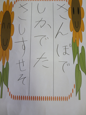 1年生が、おぼえたてのひらがなで、こんな実話の句を作りました。