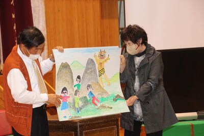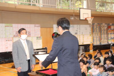 開会行事では,緑の少年団発足40周年を記念し,立ち上げに尽力いただいた功績をたたえ,河津様,上島様の表彰が行われ,子どもたちは,立ち上げられた当時の思いを詳しく知ることができました。また,ステージ発表オープニングにおいては,読み聞かせボランティアの上島様と安藤様によります大型紙芝居「押戸石の丘」(オリジナル作品)もあり,たいへん温かい雰囲気でのスタートとなりました。