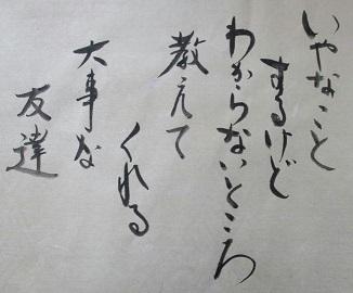 ときどきちょっかいを出してきたり、ケンカをしたりすることもあります。けれど、授業中、困ったり、分からないことがあったりすると教えてくれて、力になってくれる大事な友だちです。5年生の作品です。