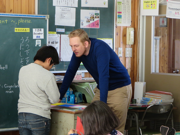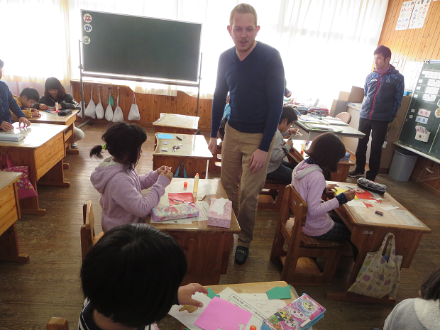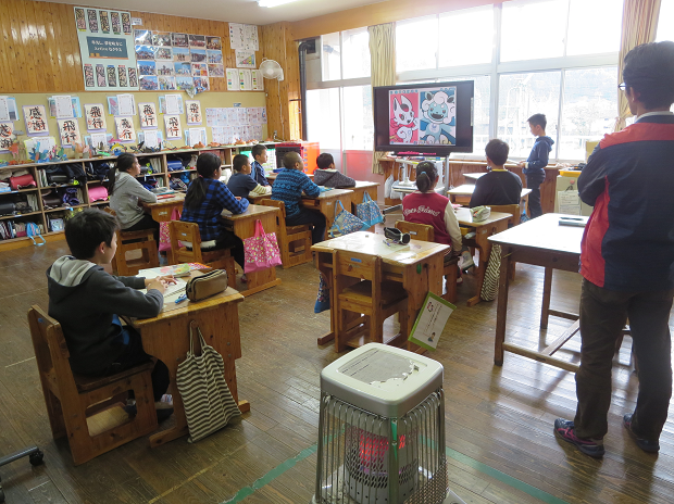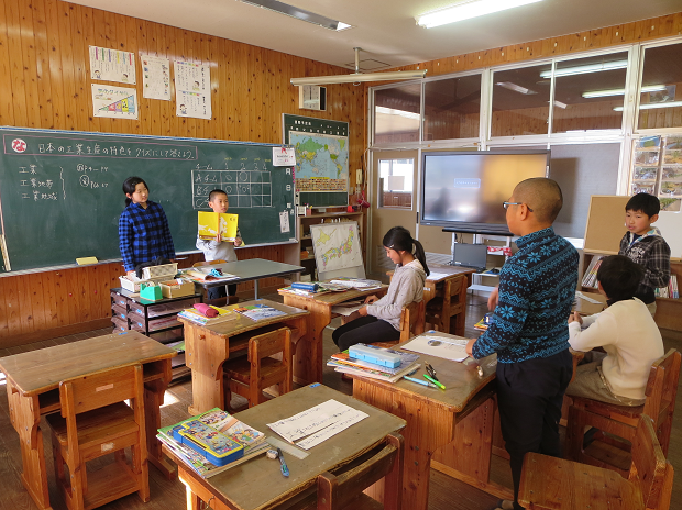 4時間目に5.6年教室で授業をしているのは町長さんです。