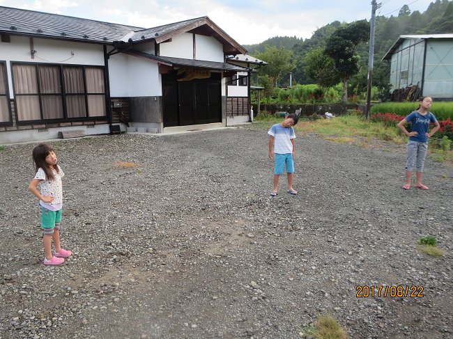 三人に合わせて、向かいのご自宅の庭で、おばあちゃんが一緒にラジオ体操をしてくださっていました。