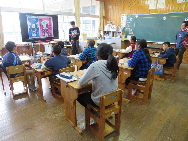 4時間目に5.6年教室で授業をしているのは町長さんです。