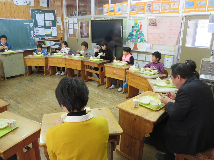 3.4年生教室では教育長さんと一緒に給食をいただきました。