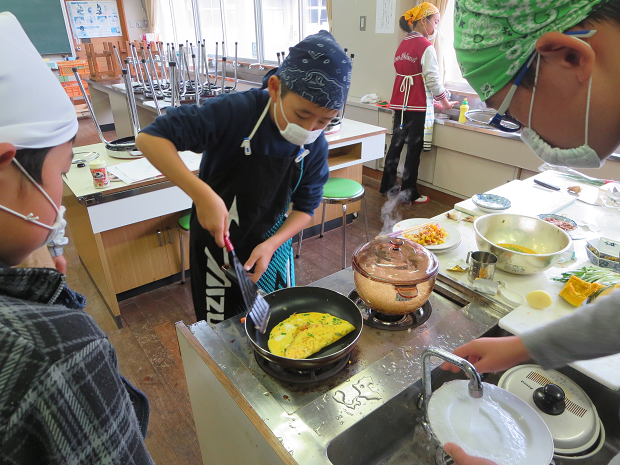 5.6年生は12月22日に家庭科「朝食作り」で、ごはんとおみそ汁ともう一品を作りました。