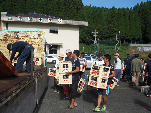学校に運ばれたら→それをおろして→種類ごとにケースに入れて→トラックに積み込みます。