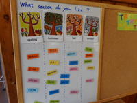「Good Morning!」と英語で元気にあいさつしてくれる金曜日。そんな子供たちに少しでも英語に触れる機会をと玄関前に掲示物を作ってくれました。「What season do you like?」英語を読めない低学年は、絵で判断したり、高学年が教えてくれたりしながら自分の名前をはっていました。「○○ちゃんは、いつが好き?」「私は夏と秋の間がいい!一番涼しくてすごしやすいもん。」子どもたちのコミュニケーションツールとしても活躍しそうです。健康観察やあいさつなど少しですが、先生たちもがんばっています。