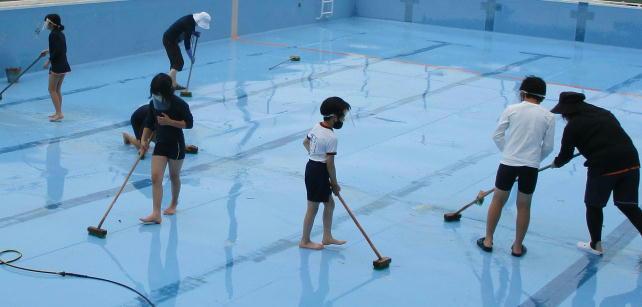 5月26日(水)に「プール掃除」がありました。3・4年生は、更衣室やトイレなどプール外の場所を担当しました。真面目に取り組んだ子どもたちは、隅々までしっかりと掃除することができました。自分たちの担当の場所の掃除を終えると、プールサイドやプールの中の掃除へ。曇り空で気温が低い中での活動でしたが、苔が生えて滑りやすくなった所、笹の葉がたくさん溜まった溝などを、ブラシで力を込めて一生懸命に掃除をしていました。掃除が終わって、掃除をする前と比べると、見違えるようにピカピカになりました。再来週より水泳の授業を始める予定ですが、泳ぎが得意な子、そうでない子も、自分たちがきれいにしたプールで、気持ちよく学習に取り組んでくれることと思います。
