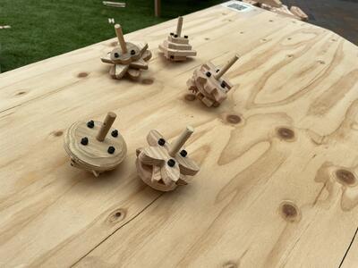 また,人工芝を敷いた周りに中原小5・6年生が作ったオリジナル独楽も展示してありました。