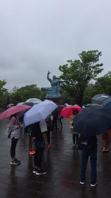 雨が降ったり止んだり,大降り小降りを繰り返しながらも,修学旅行1日目の全日程(吉野ヶ里遺跡→宇宙科学館→平和公園→フィールドワーク→原爆資料館)を終え,6年生の子どもたちは長崎市内にあります「稲佐山観光ホテル」に到着しました。みんな元気にしています。ホテルでは,長崎の食事や友達との交流を楽しむことになっています。
