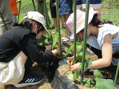 2年生は,先週の生活科の時間に,なす・ピーマン・ミニトマトの苗を畑に植えました。週末の雨と土・日の天気の良さで,苗もぐんぐん伸び始めました。そこで,昨日は支柱立てを行いました。苗の横に1本1本丁寧に支柱を立て,棒と苗をワイヤーでキュッキュッとねじりながら固定していきました。「あま~い,あま~いピーマンになれ!大きな大きなトマトになれ!」と言いながら,小さな手で一生懸命に作業を行っていました。