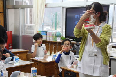 1月19日(金),3・4年生を対象に,町民課の方と歯科衛生士の方が来られ,歯と口の健康についての教室が開催されました。子どもたちは,実際に自分の歯の染め出しを行い,磨き残しや磨きにくい箇所などを知り,正しい磨き方について実践をとおして学んでいました。歯と口の健康は,健康づくりに直結しています。今後も,この学びを生活に生かしていってほしいと思います。
