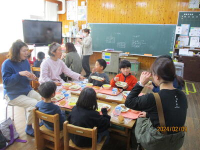 給食試食会は,4年ぶりに実施することができ,終始なごやかな雰囲気でした。保護者の方々からは,「久しぶりの給食試食会で嬉しかったです。」,「食事のマナーにも気をつけさせたいと思いました。」,「給食を食べてみて,我が家の味の濃さを見直したいと思いました。」などの声も聞かれ,給食をとおして前向きに考えていただける姿勢にたいへん感心いたしました。来年度は,栄養や食育について親子で考える時間なども行う予定です。