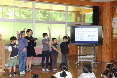 17日(金)の業間に児童集会がありました。今年度最初の委員会は,保健・給食委員会。委員長の武田さんを中心に,生活習慣を見直すためのクイズを自分たちで考え,事前にスライドや発表の準備をして臨みました。歯磨きをするタイミングやYouTubeを視聴する時間など,1年生でも答えられるよう2択・3択で工夫されていました。シンキングタイムのジェスチャーもあり楽しい集会となりました。最後の感想発表にも意欲が見られました。6月は,「人権・図書委員会」が担当してくれます。