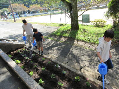 11月2日(土)のぎんなん祭に向け、子どもたちはステージ発表だけでなく、お客様を迎える準備も始めました。まずは、花壇の花を秋・冬用の花に植えかえました。パンジー、ビオラ、ノースポールを手際よく植えていました。