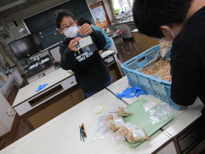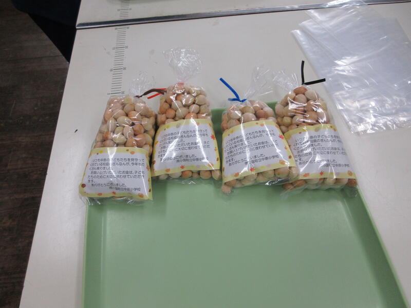 次に、校長先生が洗ってくださったぎんなんが乾いたので、販売用の袋詰めを行いました。毎年高学年を中心に行っています。昨年の経験を生かし、6年生が5年生をサポートしながら進めていました。「丁寧に入れる」「きずをつけない」など、大切に扱う気持ちをもちながら行っていました。
