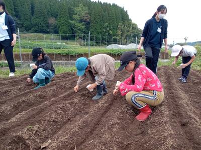 24日(木)の放課後子ども教室において、ナカバルツクル会の方々の指導のもと、麦の種まきが行われました。この日は、町民課に実習中の大学生の方々も参加し、賑やかな種まきとなりました。「パラパラパラ・・・っとまくんだよ~」「土は、ふわっとかぶせていくんだね」など、お互いに声をかけながら、行っていました。2年生は、昨年も経験しているので、その経験がよく生きていたようです。きっと、1年生も来年はこの経験を次の1年生に伝えていってくれることと思います。前校長の井芹先生が、事前に畝作りをしてくださっていましたので、スムーズに行うことができました。ありがとうございました!次は、麦踏みが楽しみですね。